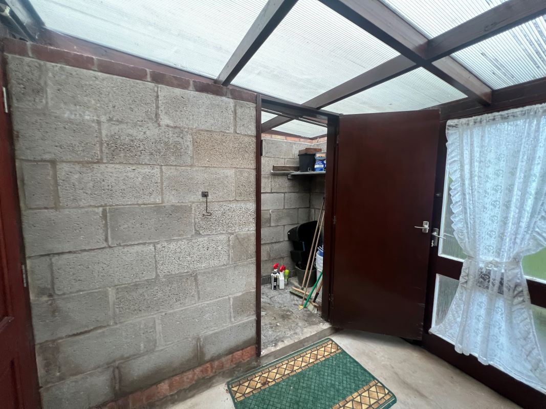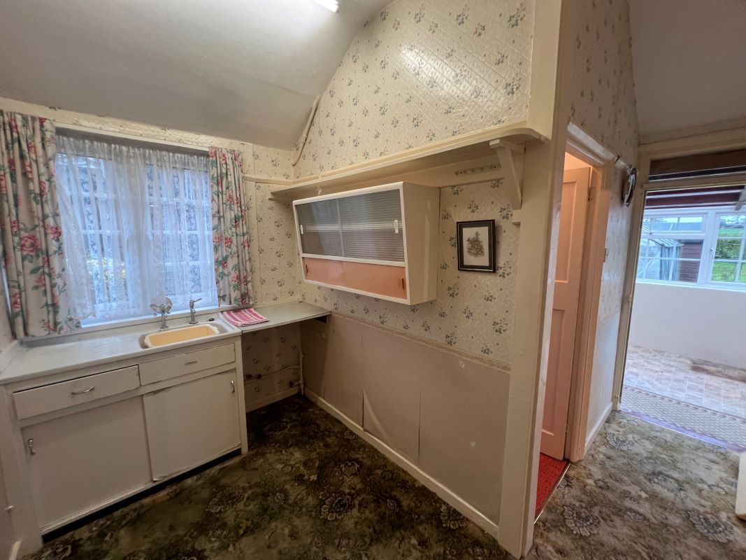 A semi detached bungalow, standing back from the road behind a driveway and foregarden.Accommodation