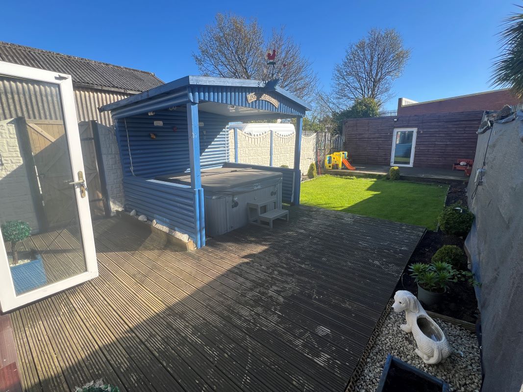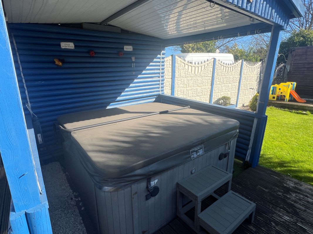 Outside: Gardens, Rear Outbuilding/Garage/Workshop, Jacuzzi.